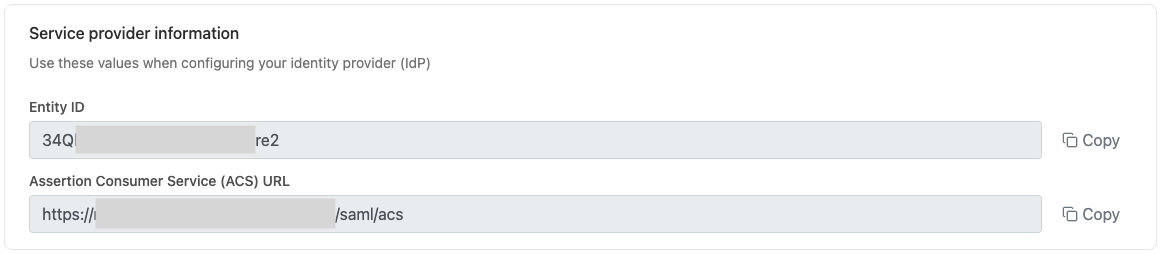 3. For Service provider information, copy the values provided and use them to configure your identity provider (IdP).
